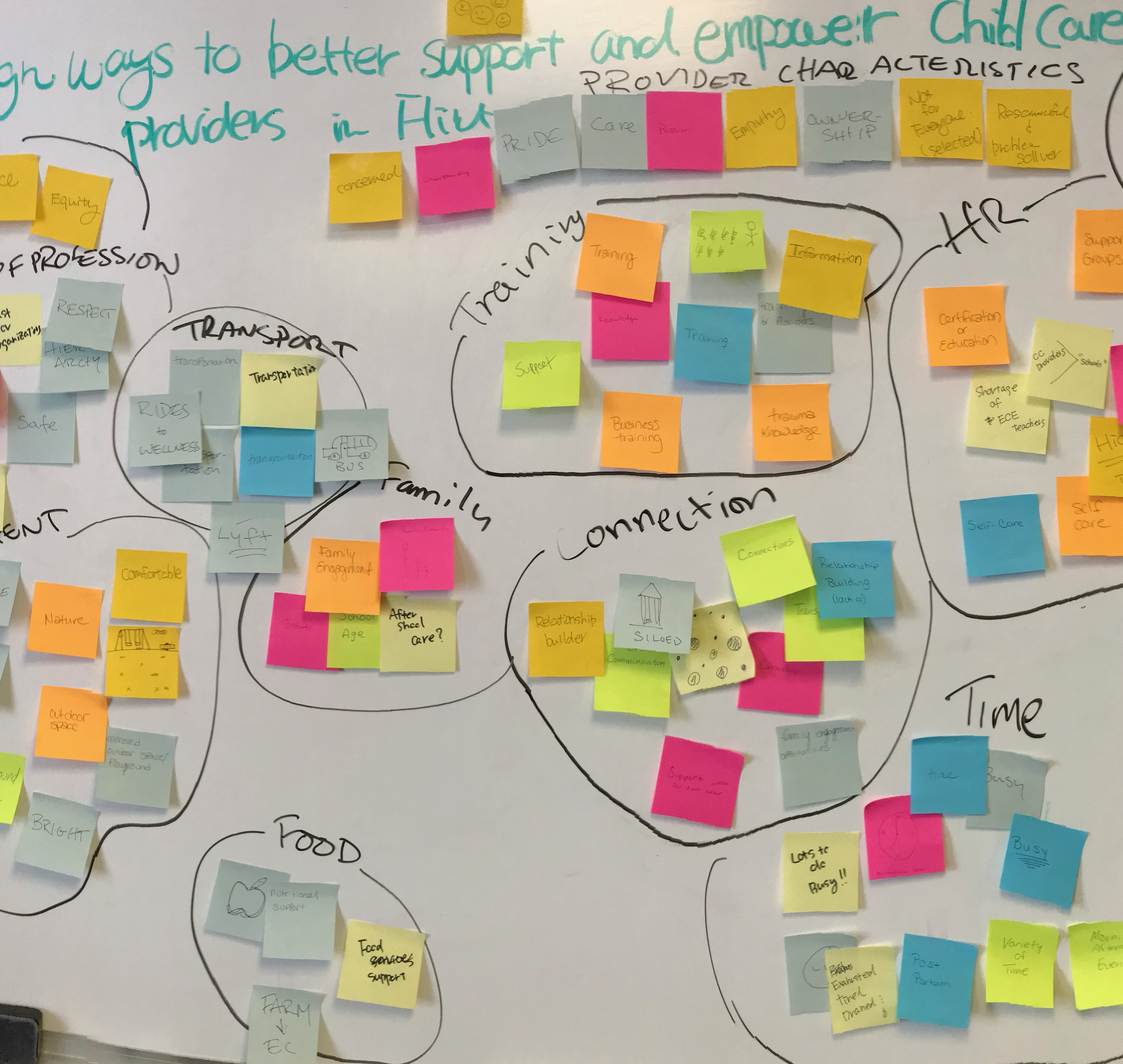 A workshop with a regional organization, Child Care Network, was crucial to problem framing. We generated categories of issues through a “brain-swarming” and affinity grouping process, and through persona-writing and persona-mapping, we ended up with a primary persona whom we named “Andrea,” to guide our next steps.